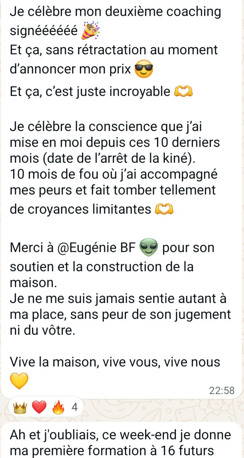Et parce que c'est neuroscientifique : s'entourer de gens qui vivent déjà ce que tu vises, c'est la garantie de modéliser leur état interne et leur succès (à ta manière!). On dit merci à tes neurones miroirs qui seront activés dans mes espaces... Quand on connaît nos ressources, on sait les utiliser.